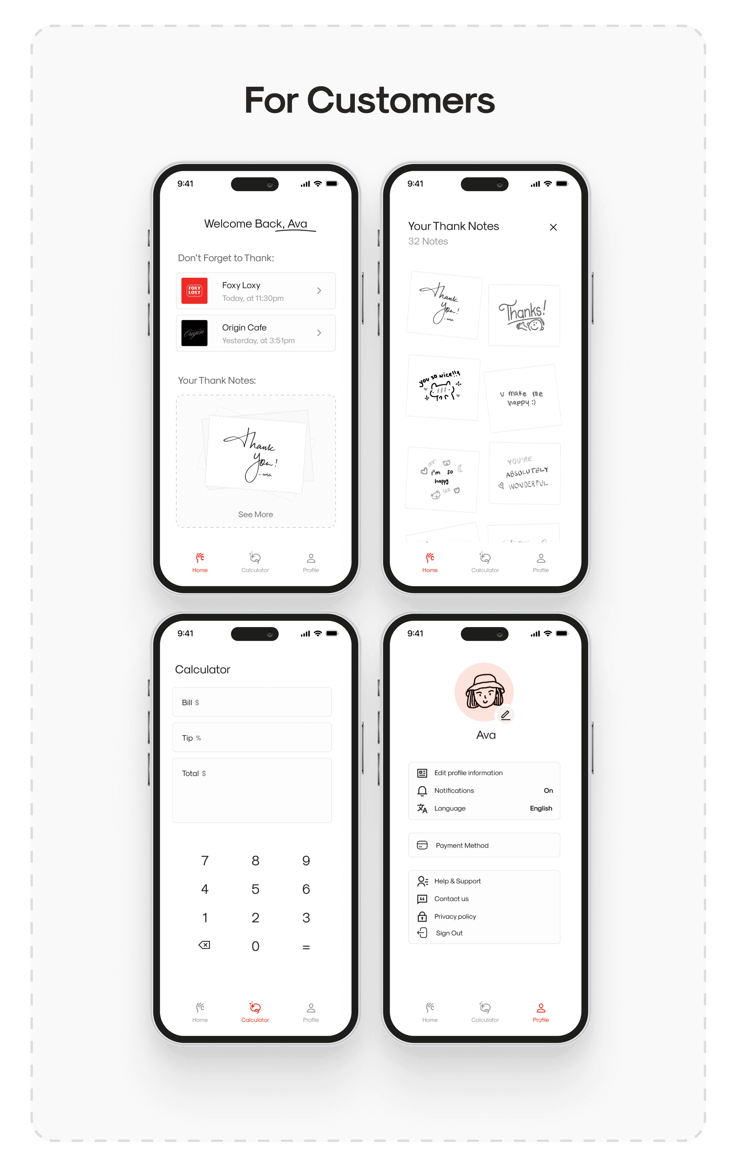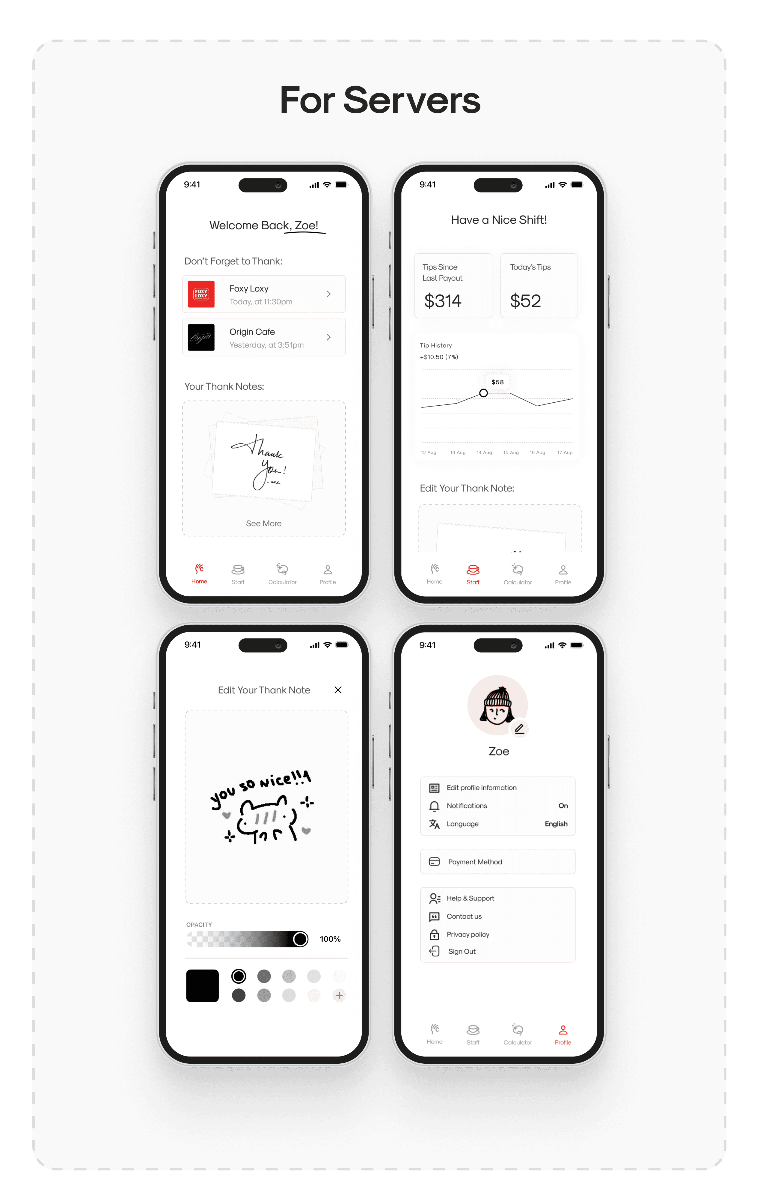 With the full app, customers can collect thank you notes from the servers they tipped. Servers can track their tip amounts and personalize a thank you note to send to customers.