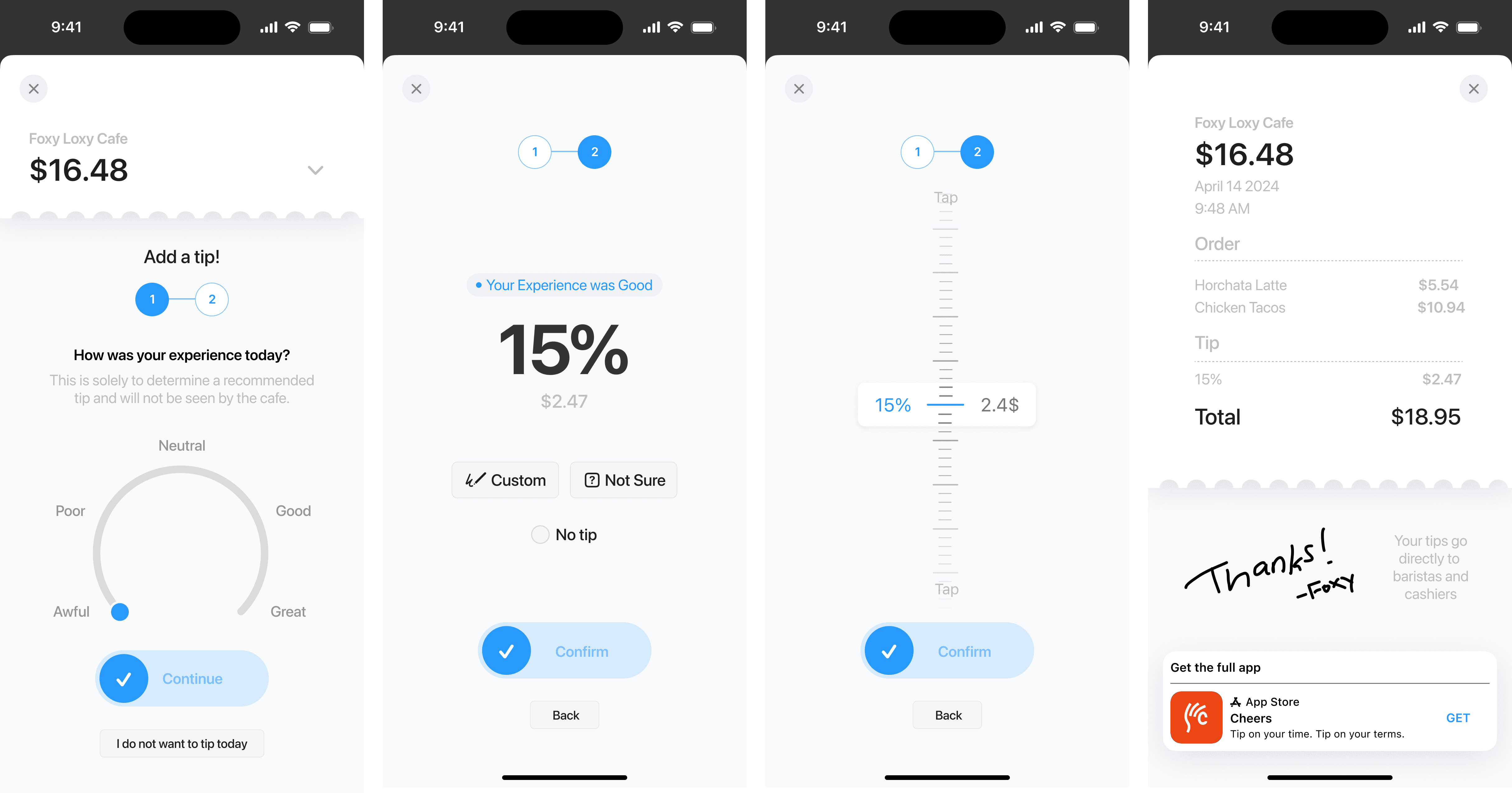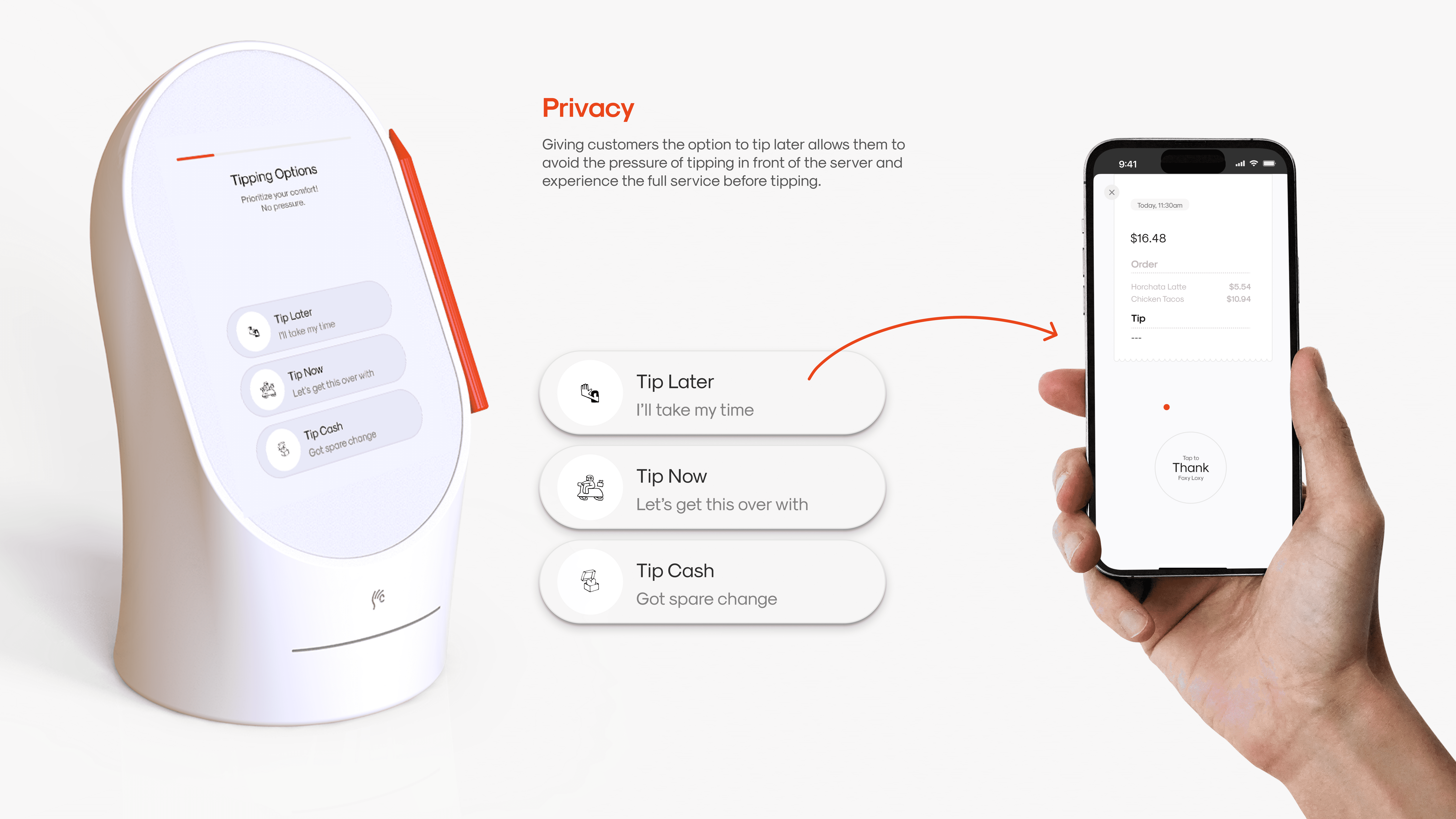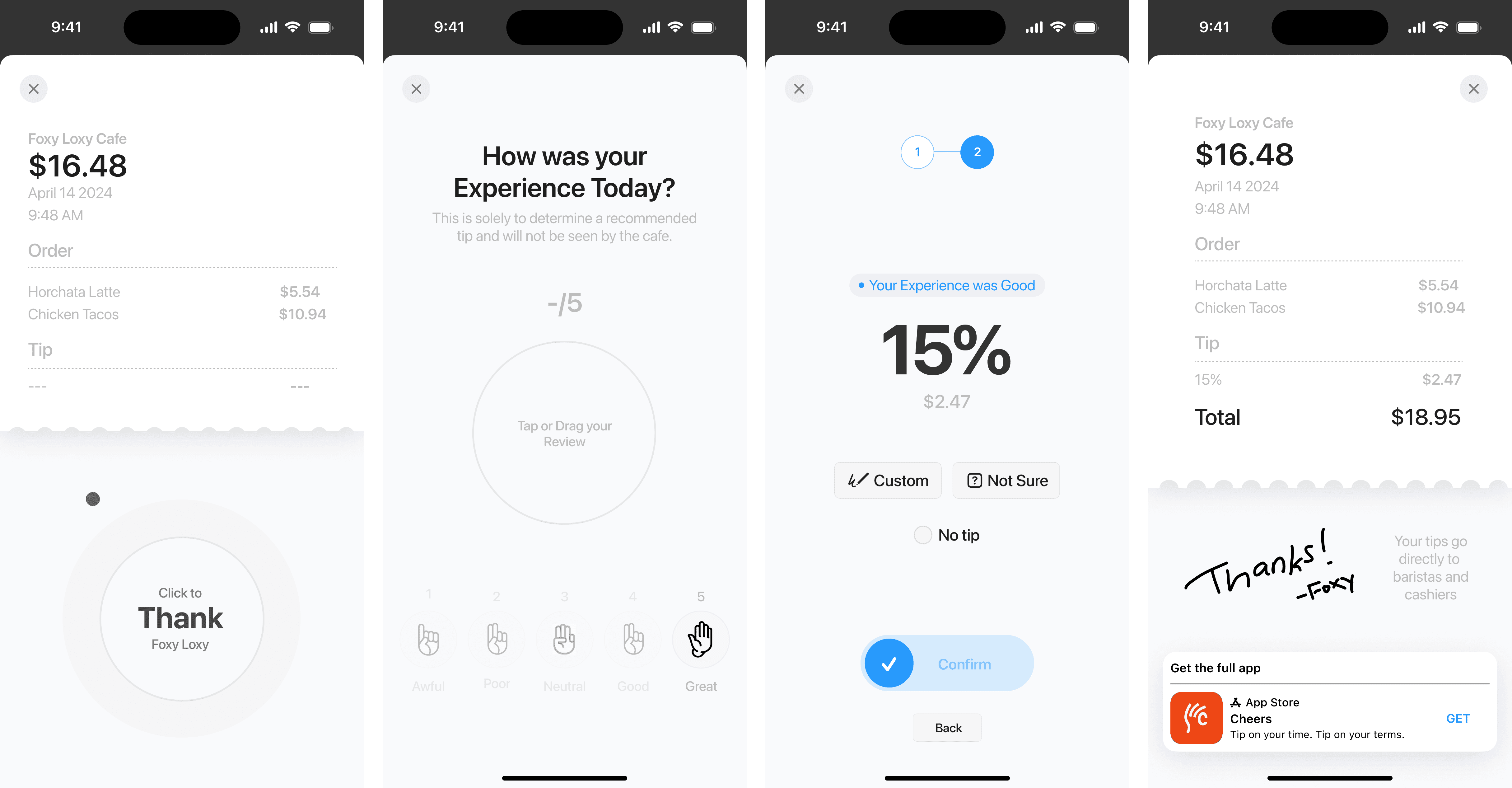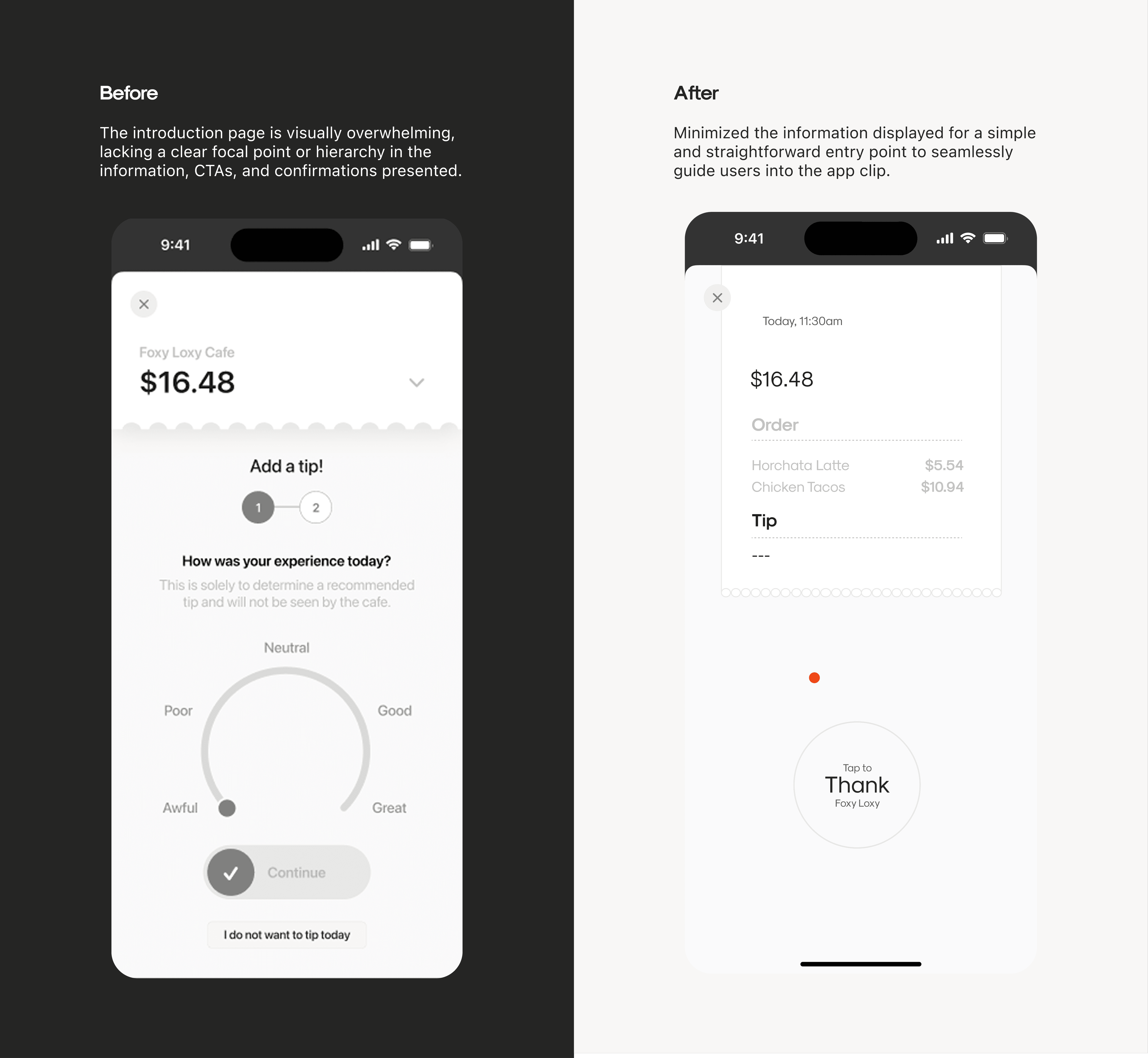 We explored an app clip solution—an RFID-activated app that doesn't require downloading—allowing customers to tip on their phones after their cafe experience, giving them the flexibility to make confident tips at their own pace.