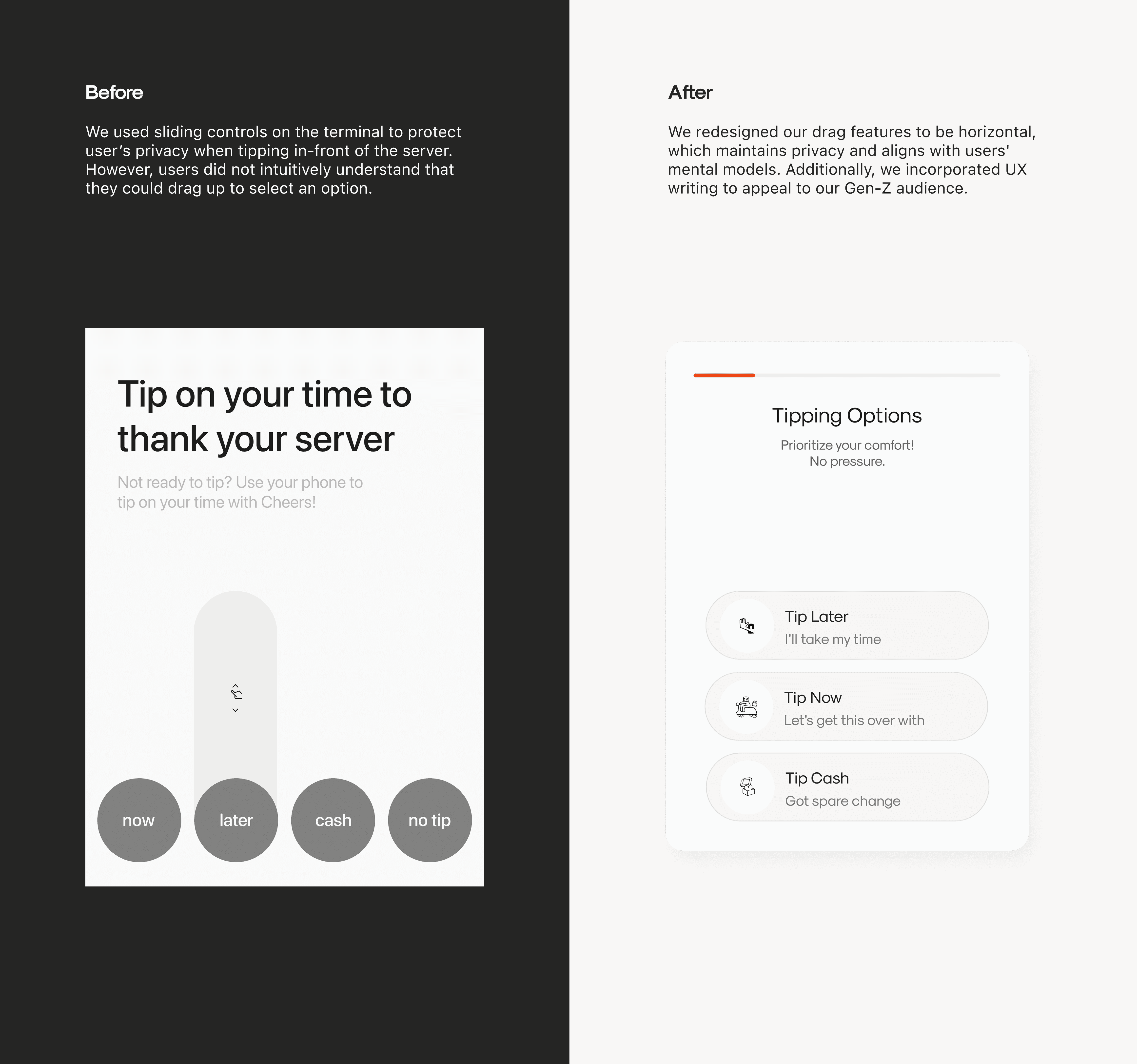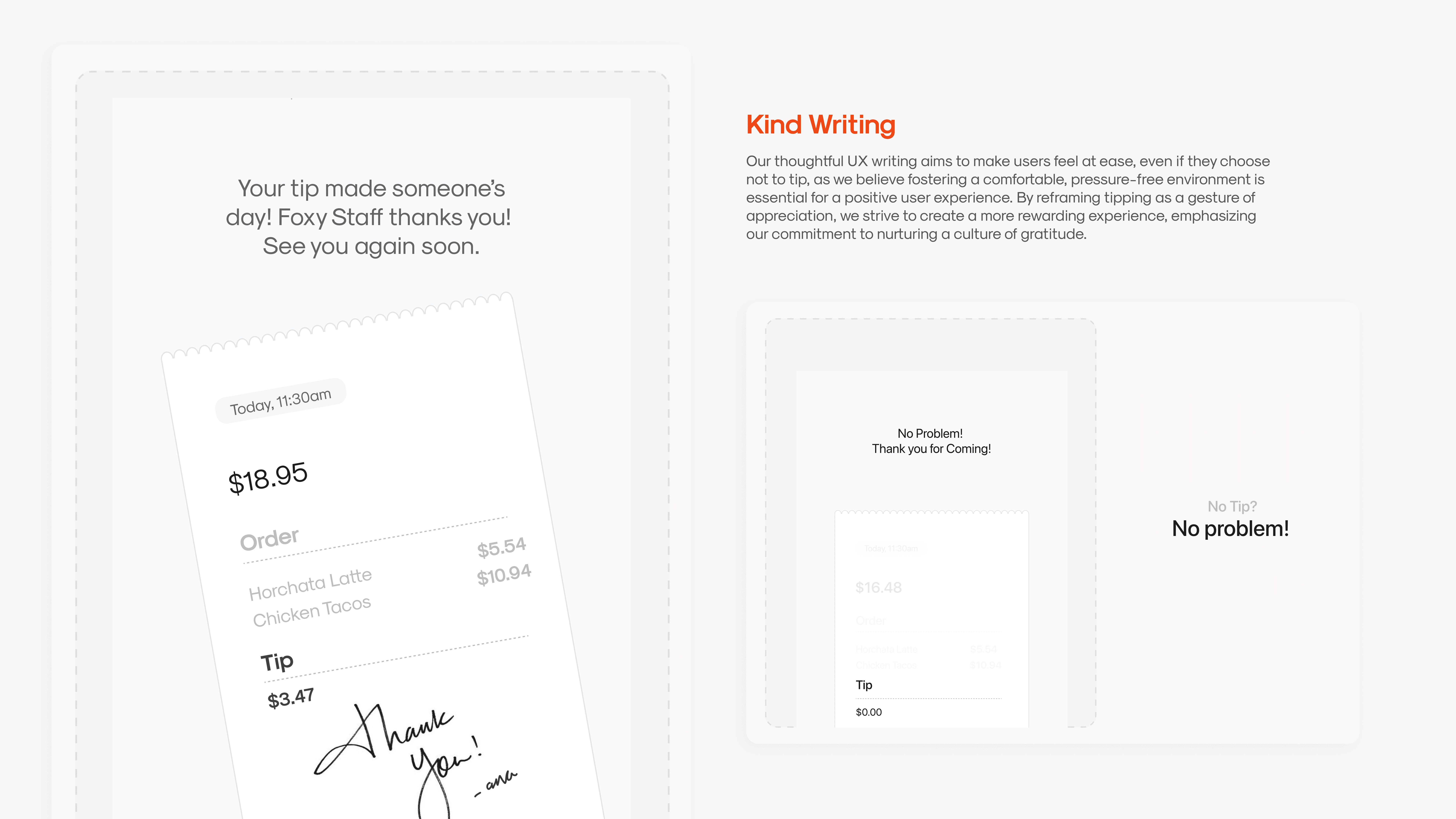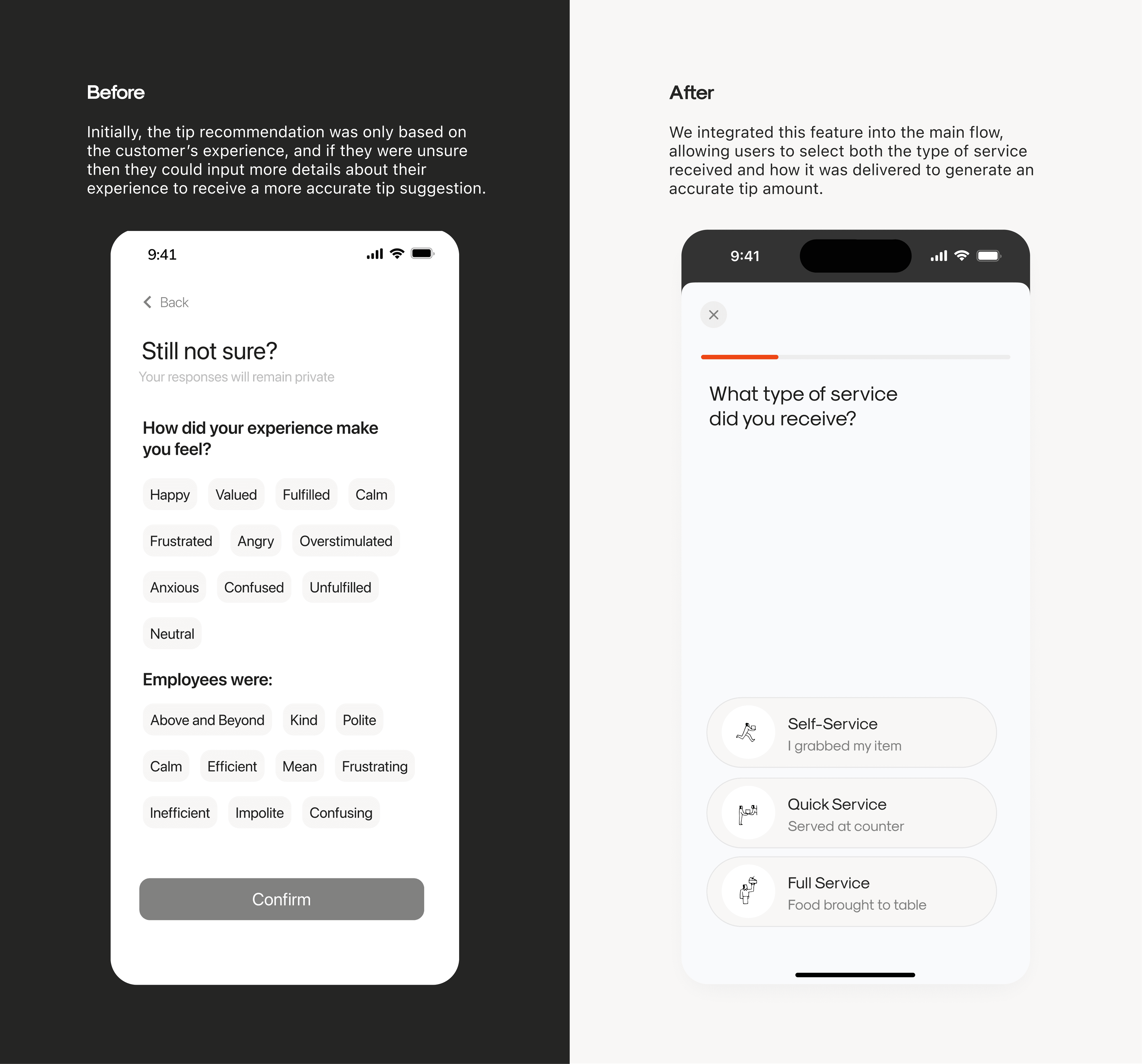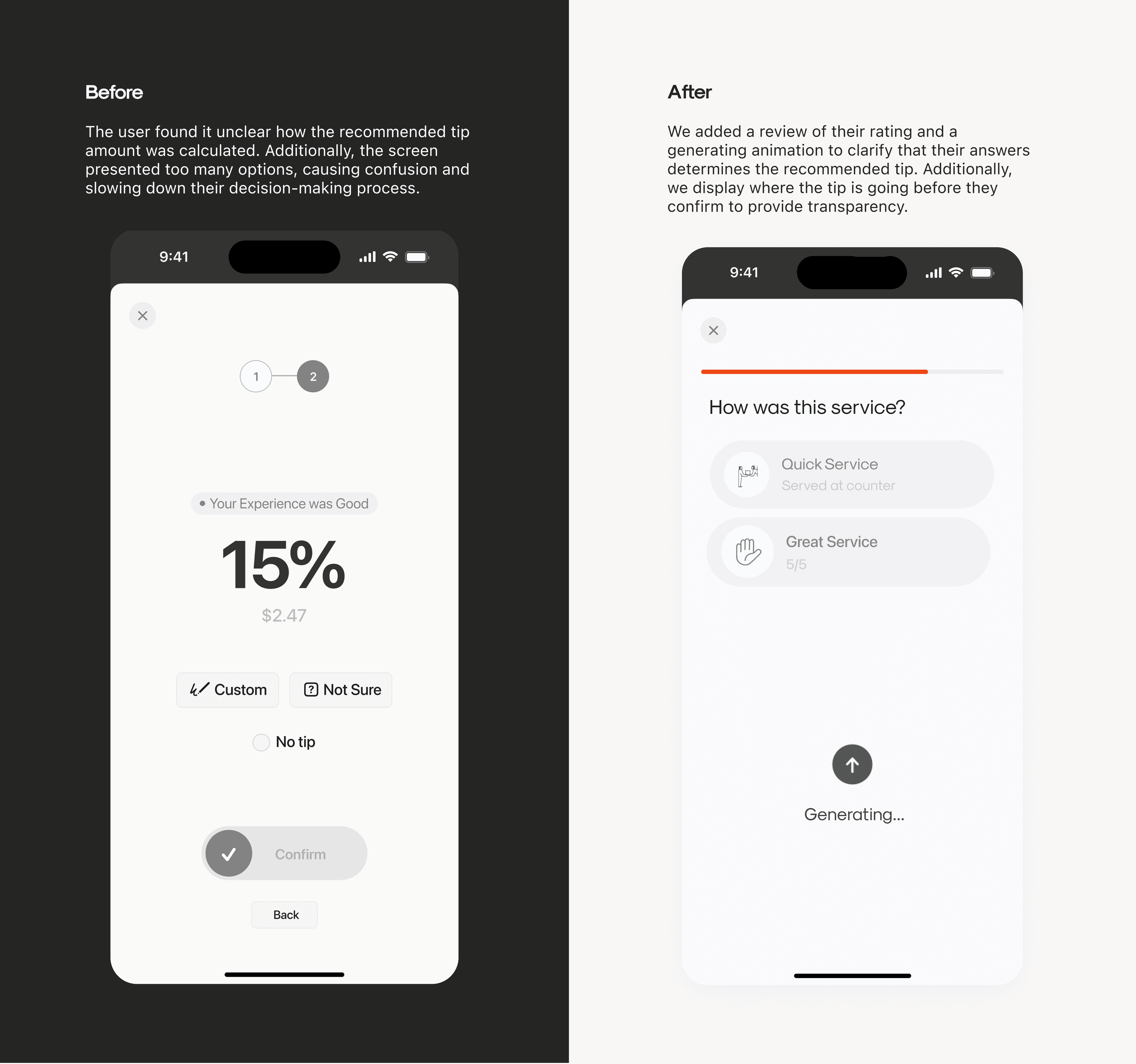 We explored an app clip solution—an RFID-activated app that doesn't require downloading—allowing customers to tip on their phones after their cafe experience, giving them the flexibility to make confident tips at their own pace.