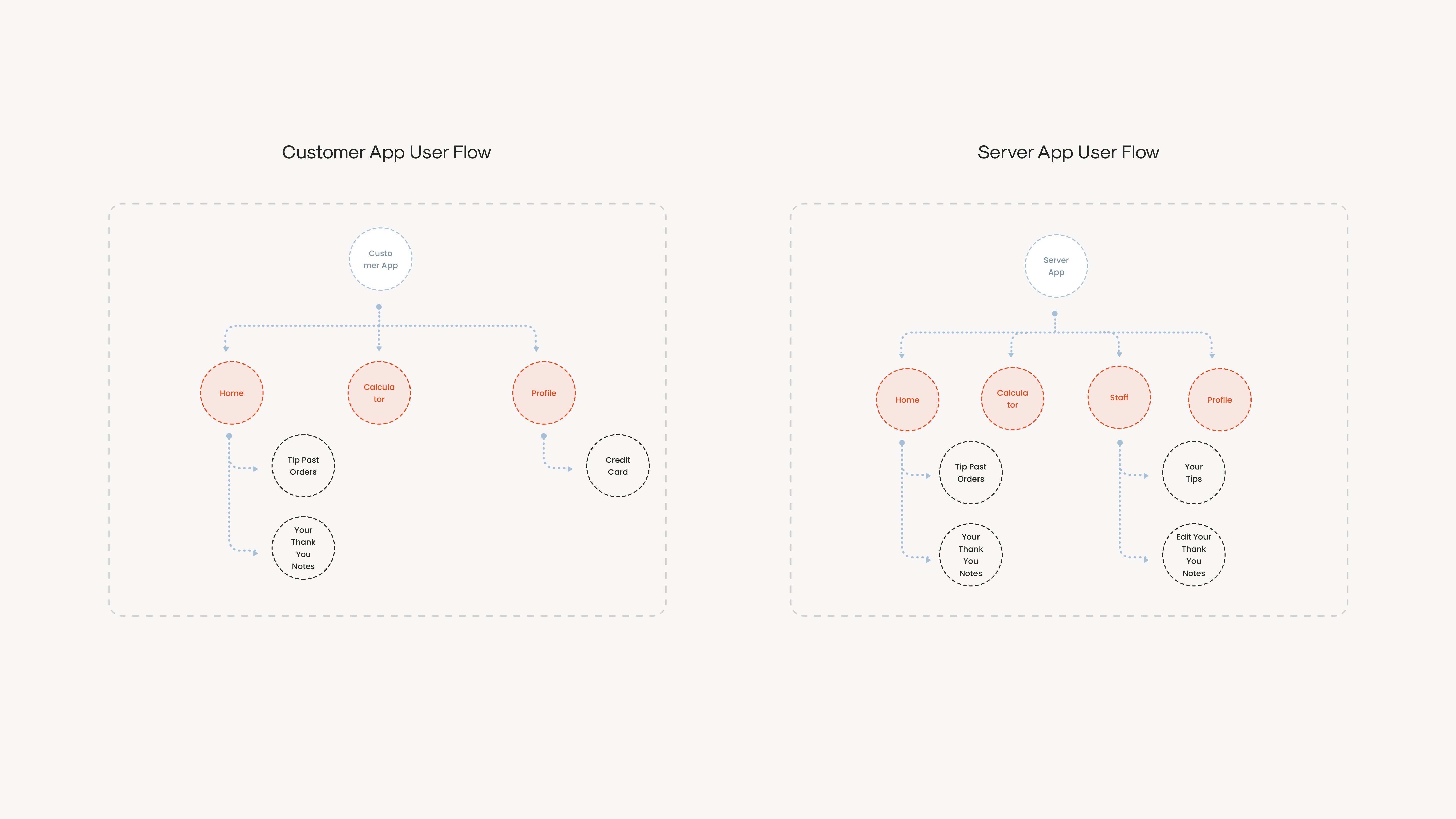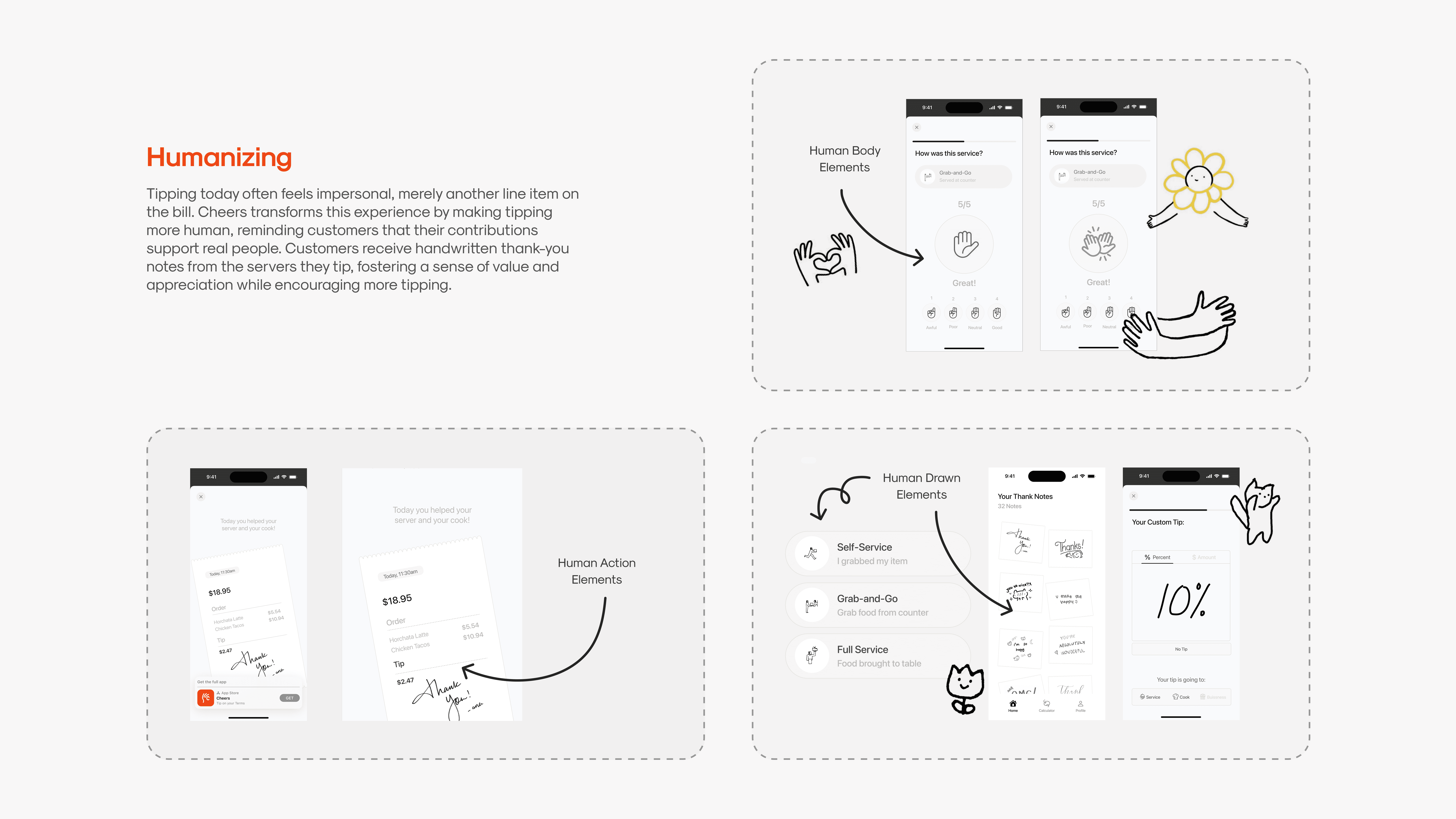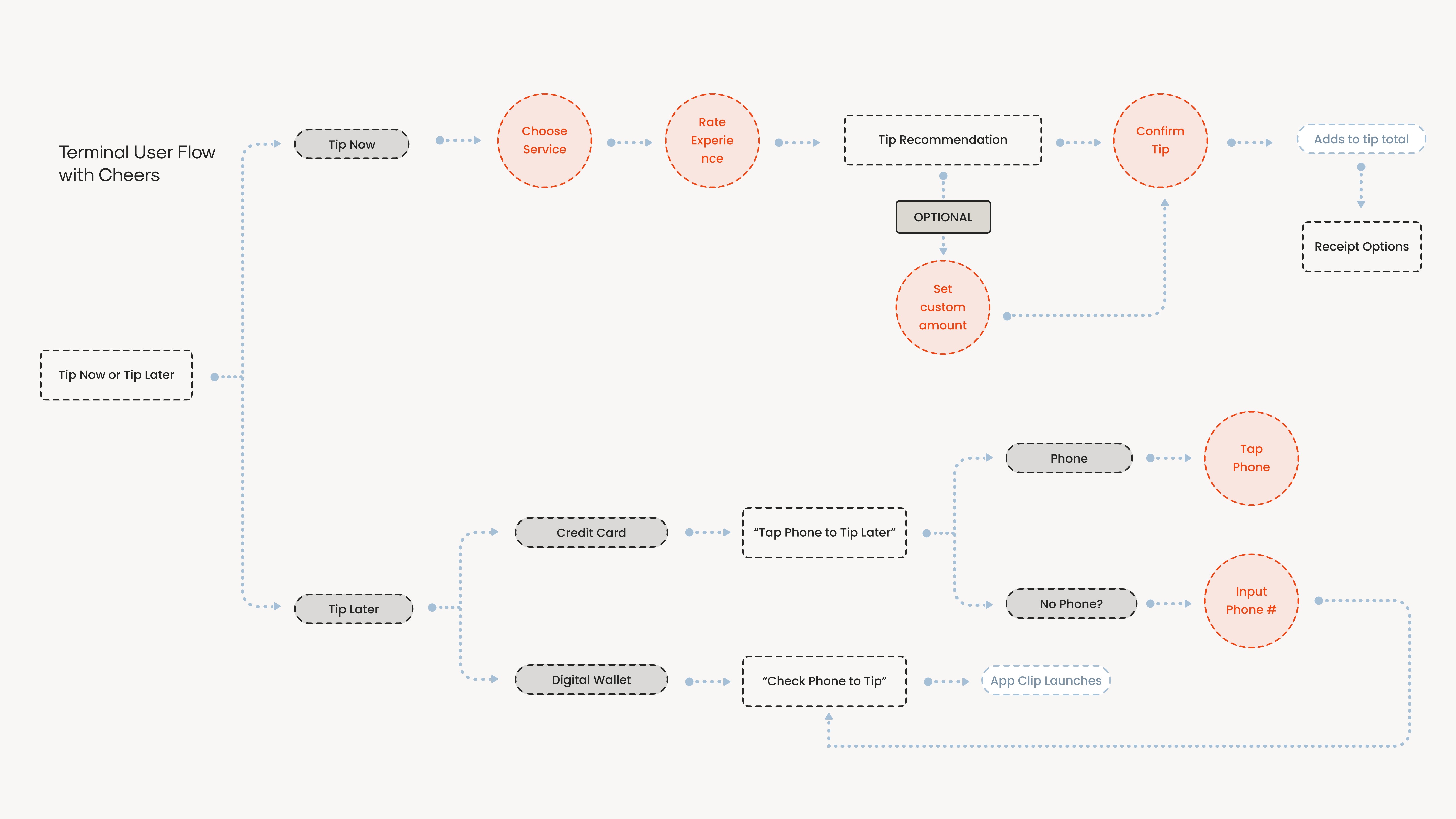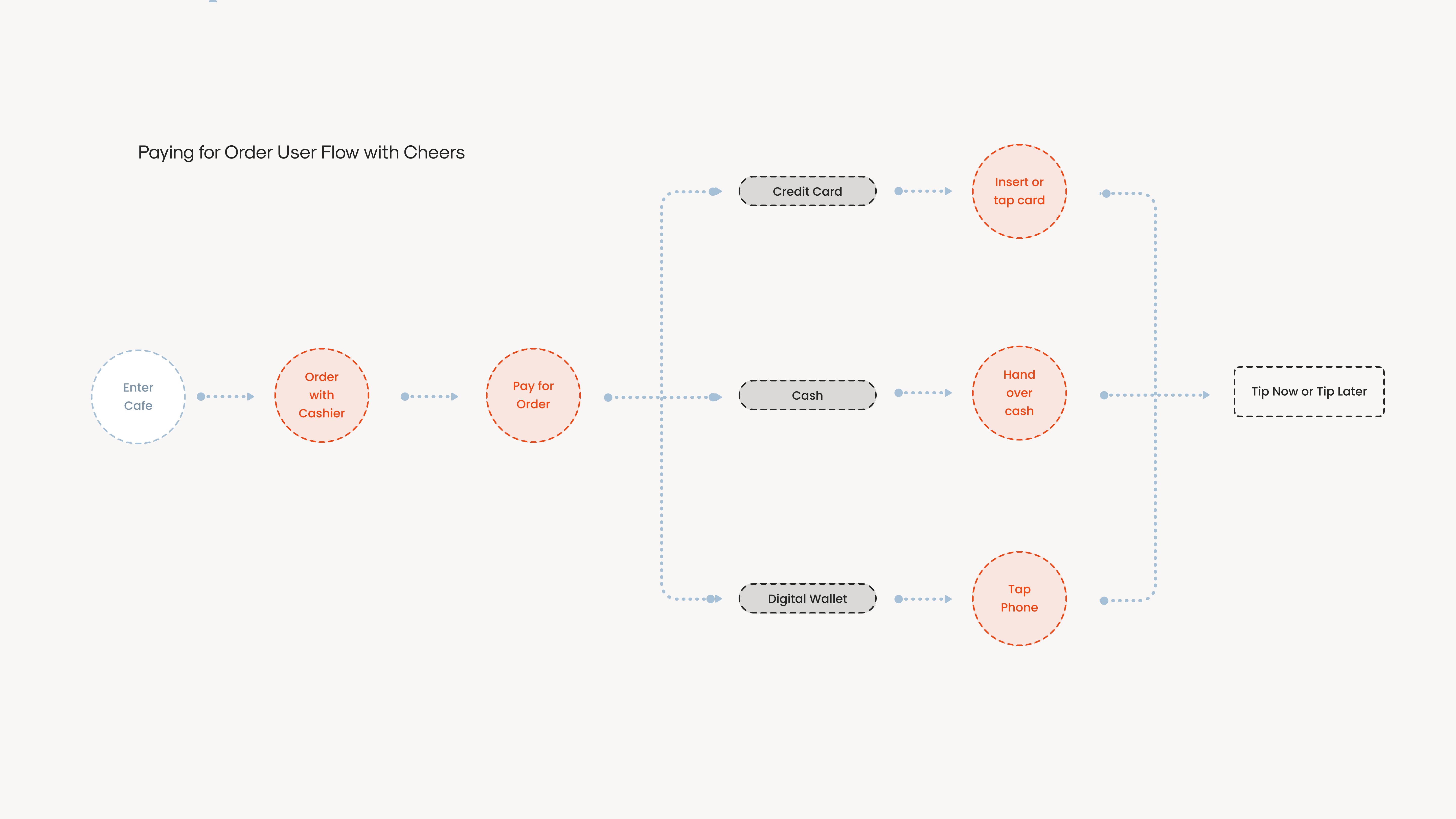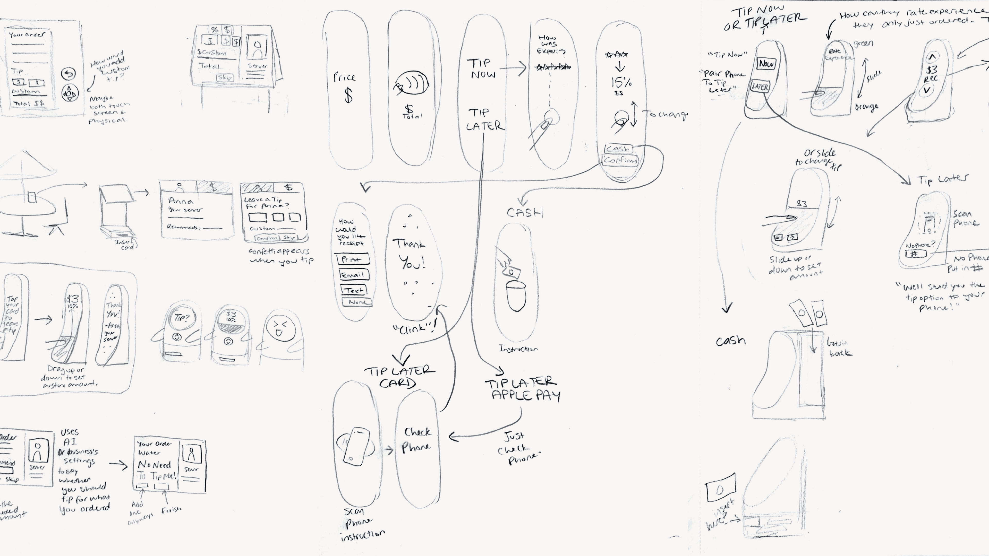 We sketched potential flows for a new cafe tipping system and organized our final decisions into a comprehensive user flow.