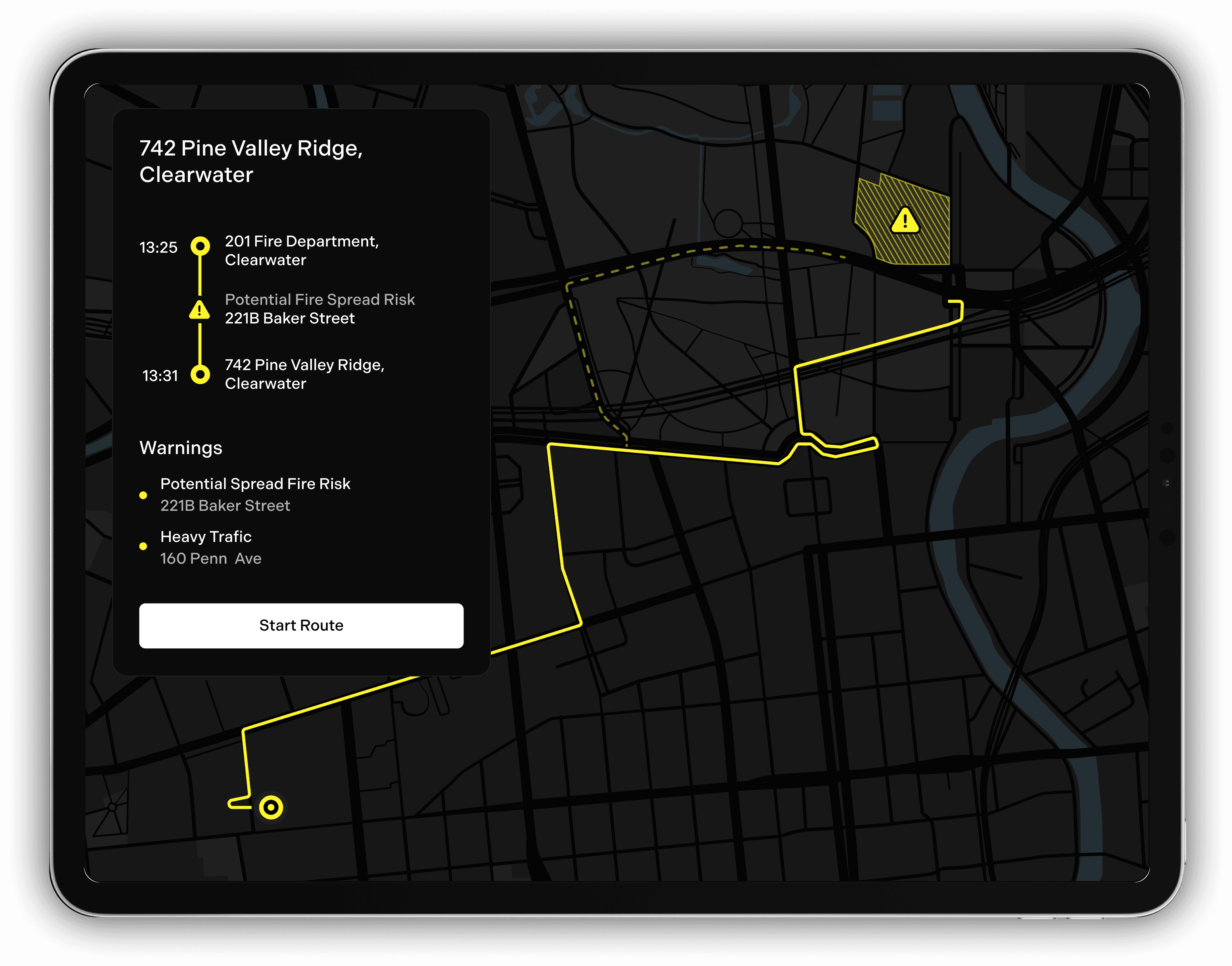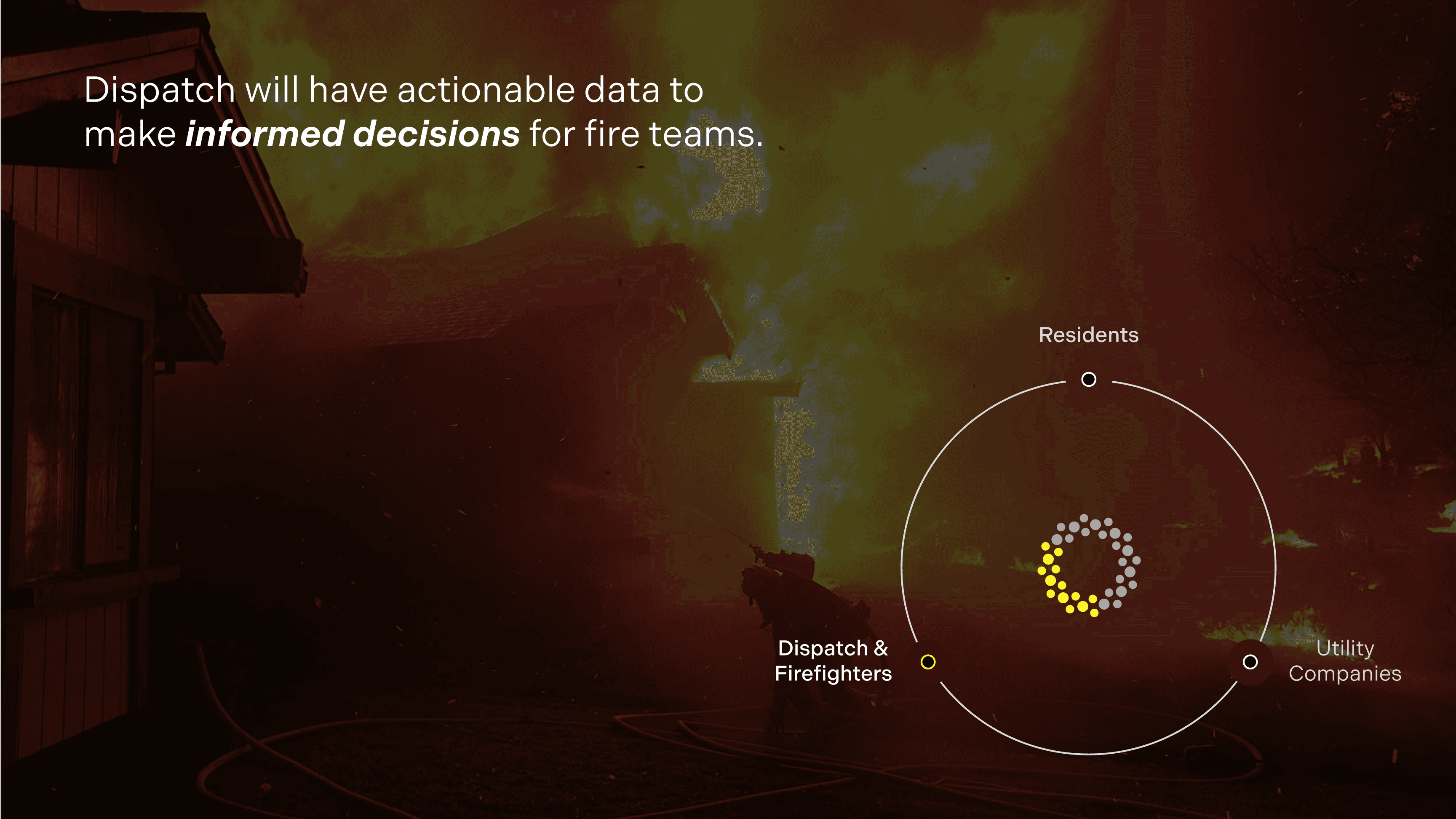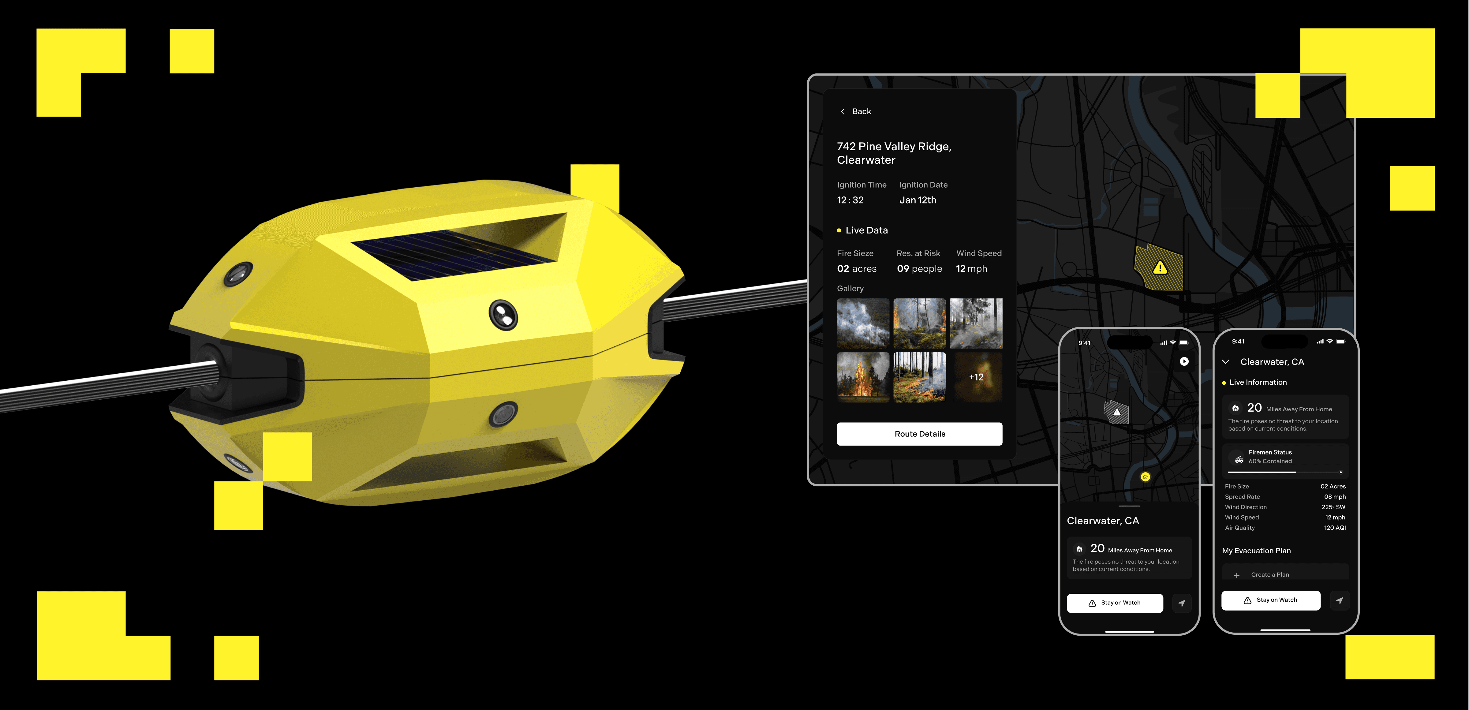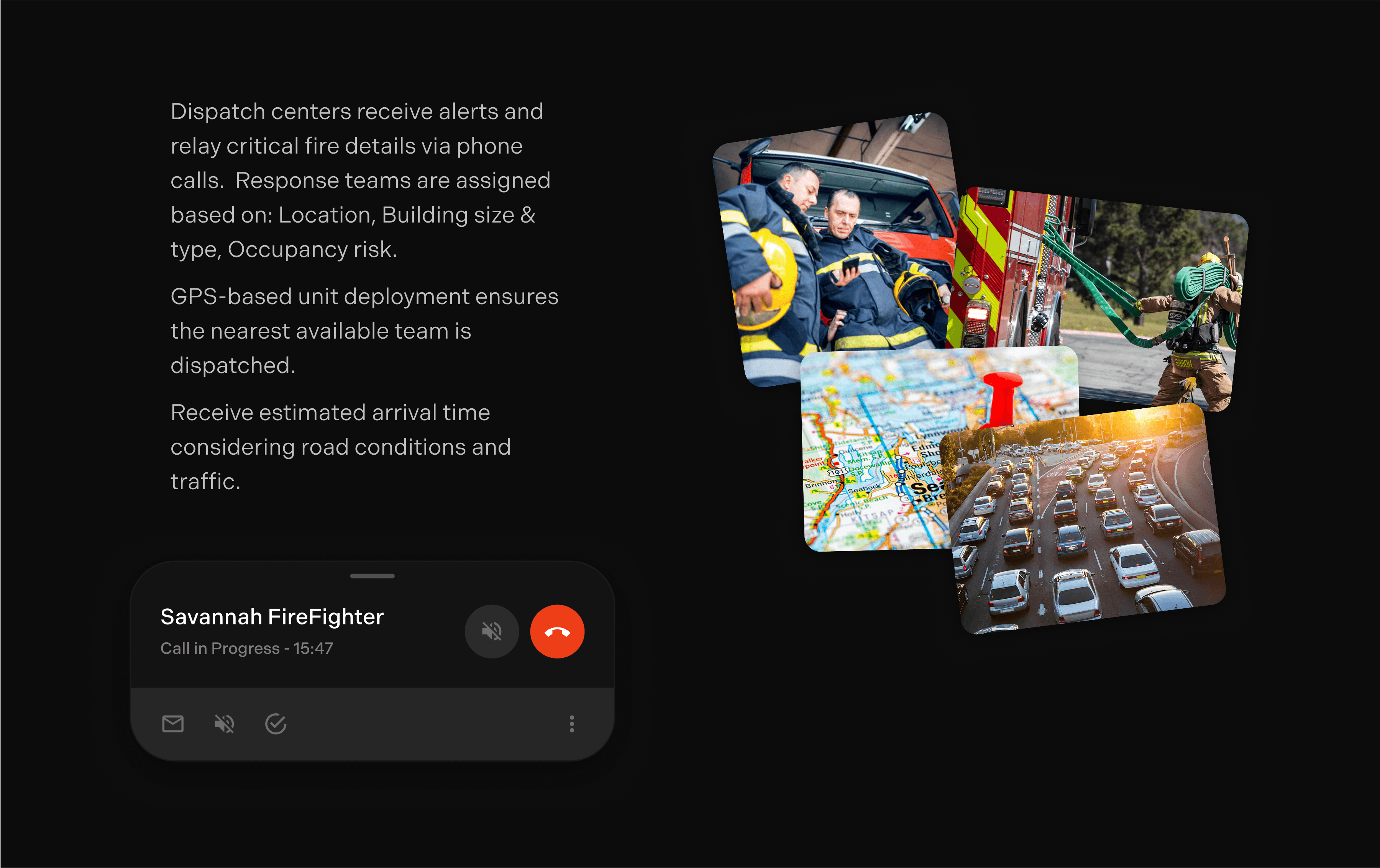 Firefighters receive key information on fire location, size, spread, and at-risk residents, along with optimized routes to the scene.