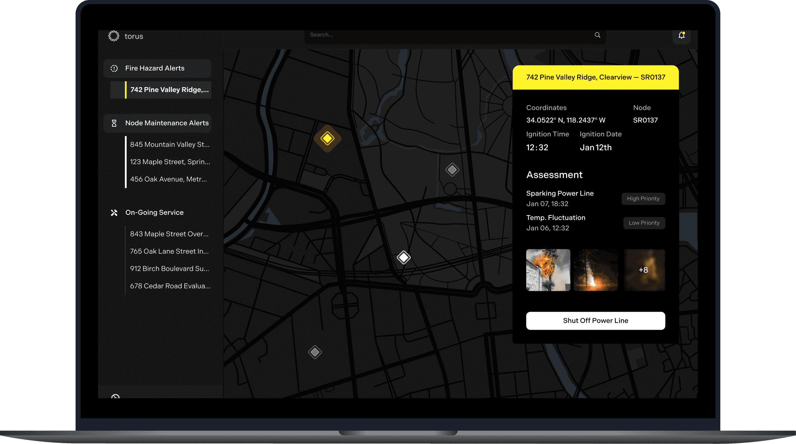 If a fire originates from a power line, utility companies are immediately notified to shut off the line. They also manage the Torus node network, which serves a dual purpose, monitoring for both fire hazards and maintenance issues. On the utility dashboard, each node is represented as a diamond: yellow indicates a fire hazard, while white signals a maintenance alert, giving operators a clear, real-time map of network activity.