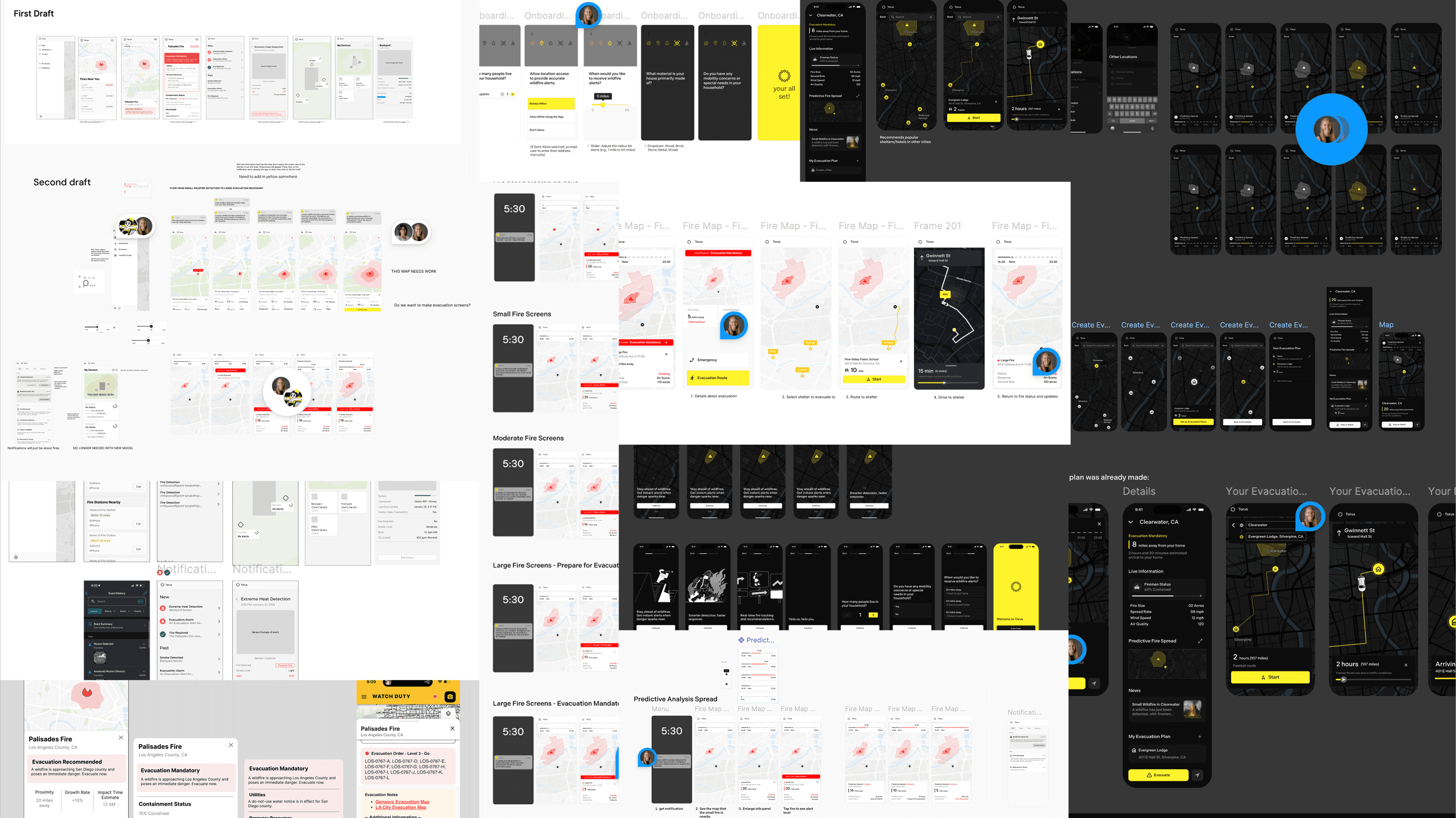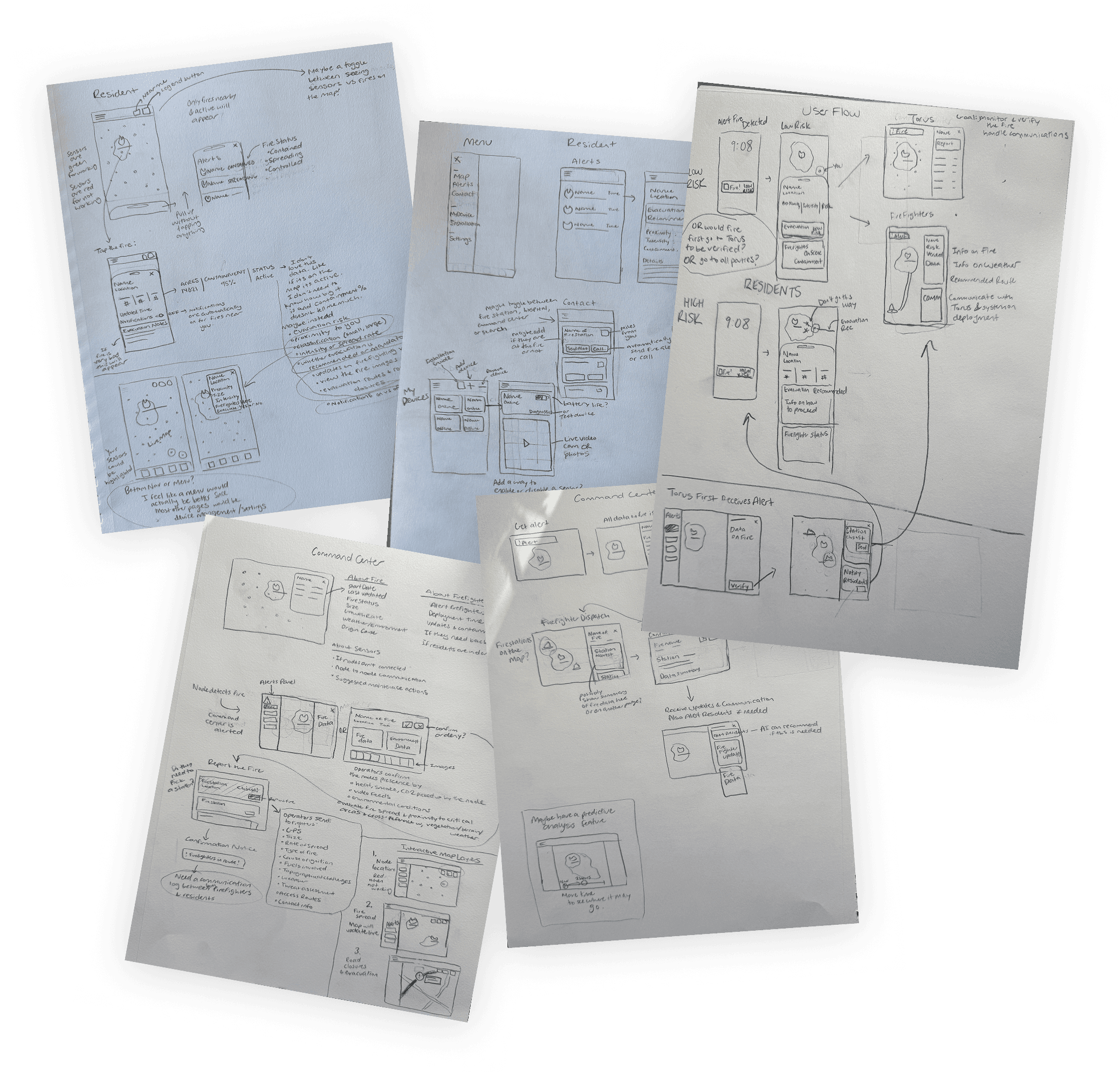 From early sketches to mid-fidelity Figma screens, we explored layouts, key information, and user flows for the Torus firefighter interface. While the goal is to integrate Torus data into existing systems, our designs demonstrate how that integration could look, providing a visual uplift to improve data clarity and enable faster, more informed decision-making.