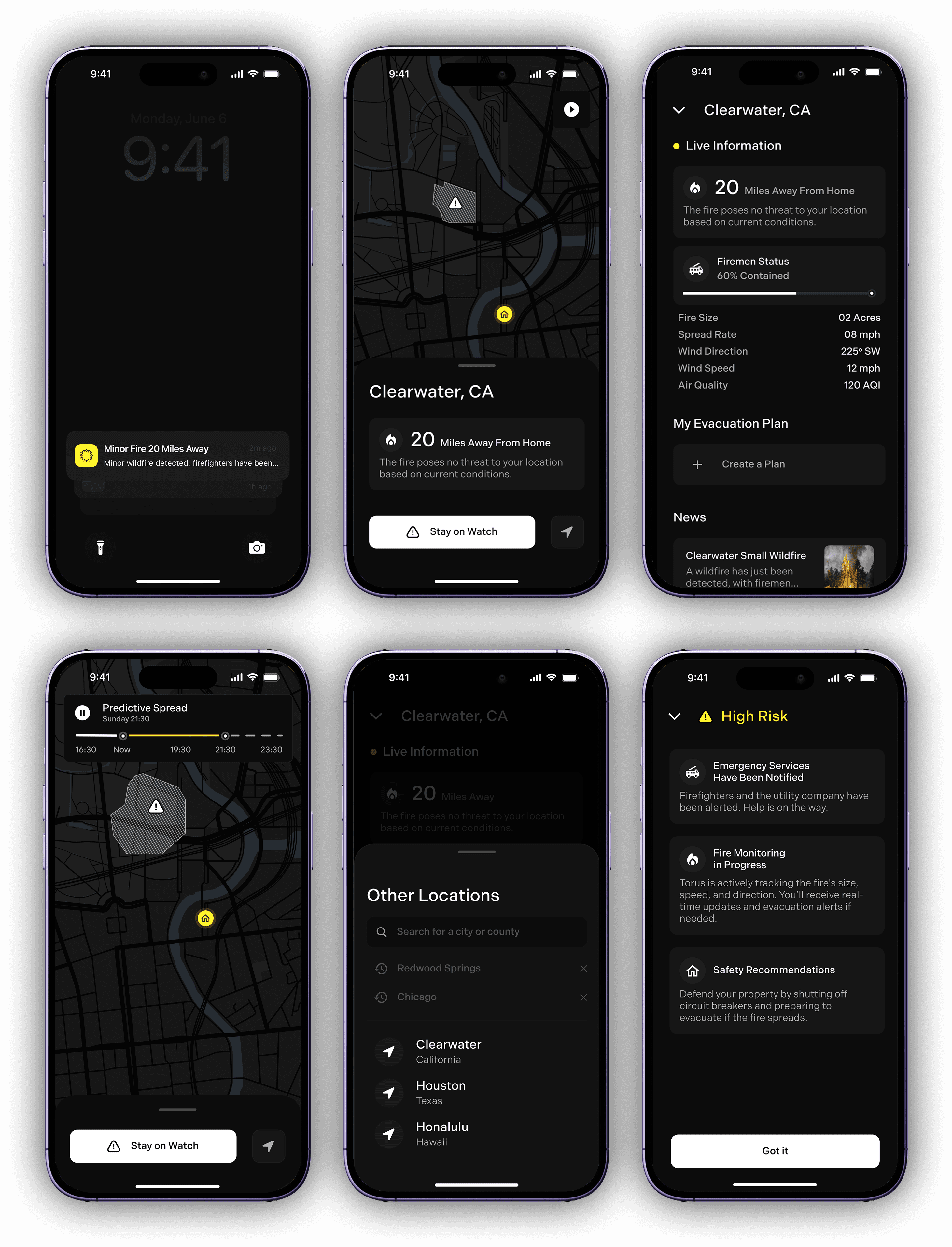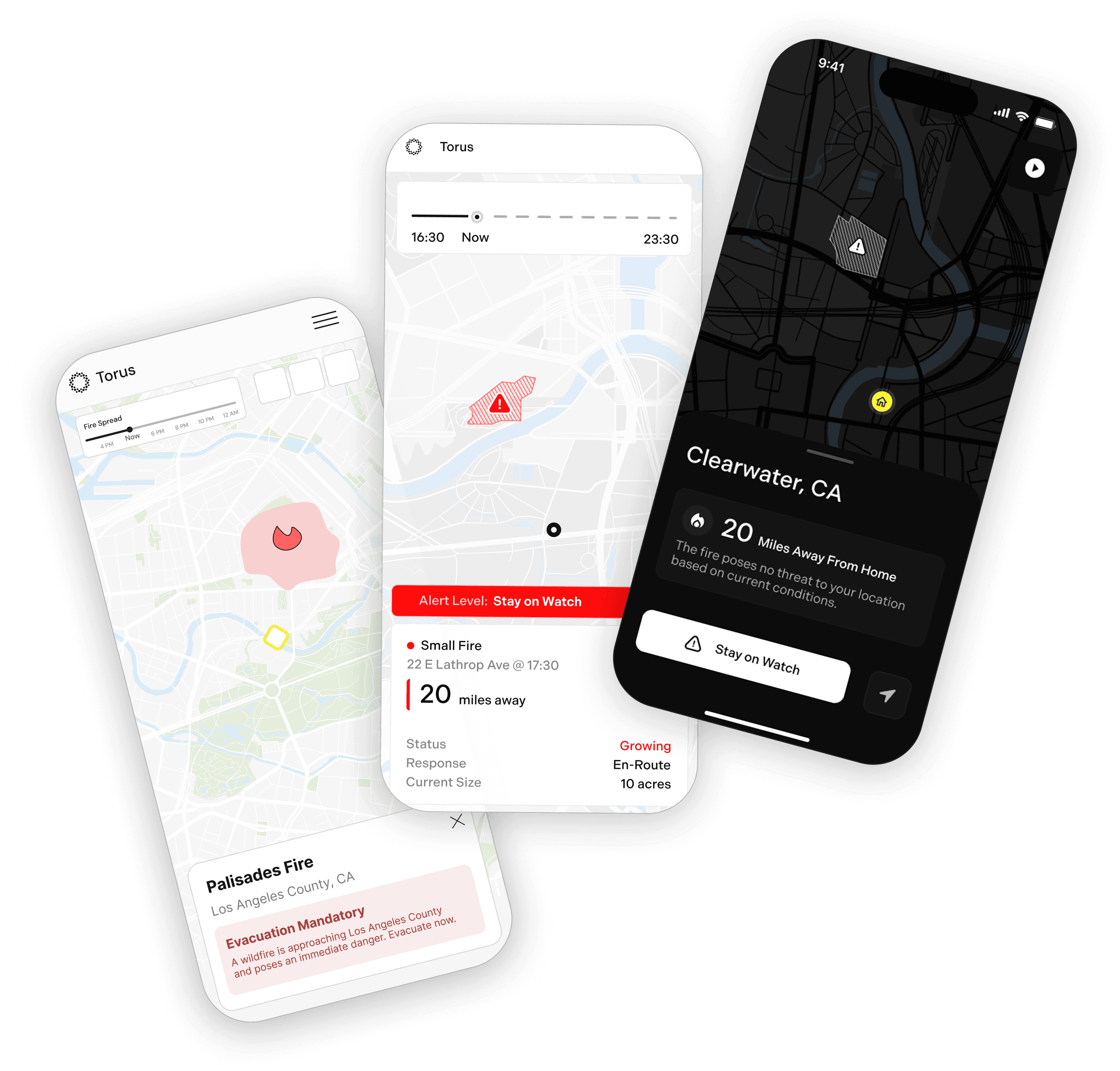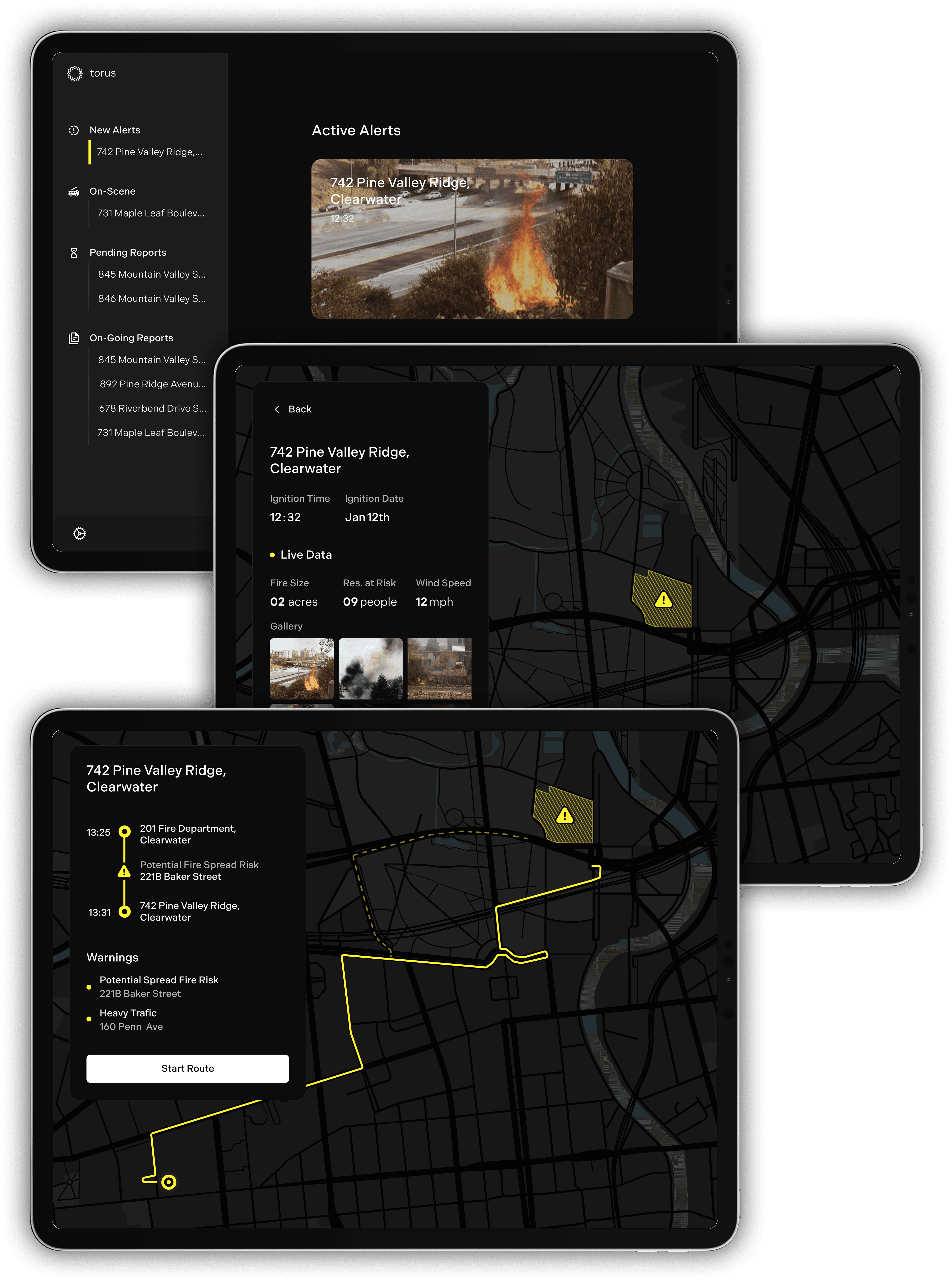 Residents near the fire receive Torus app alerts with evacuation instructions, emergency contacts, and safe travel routes.