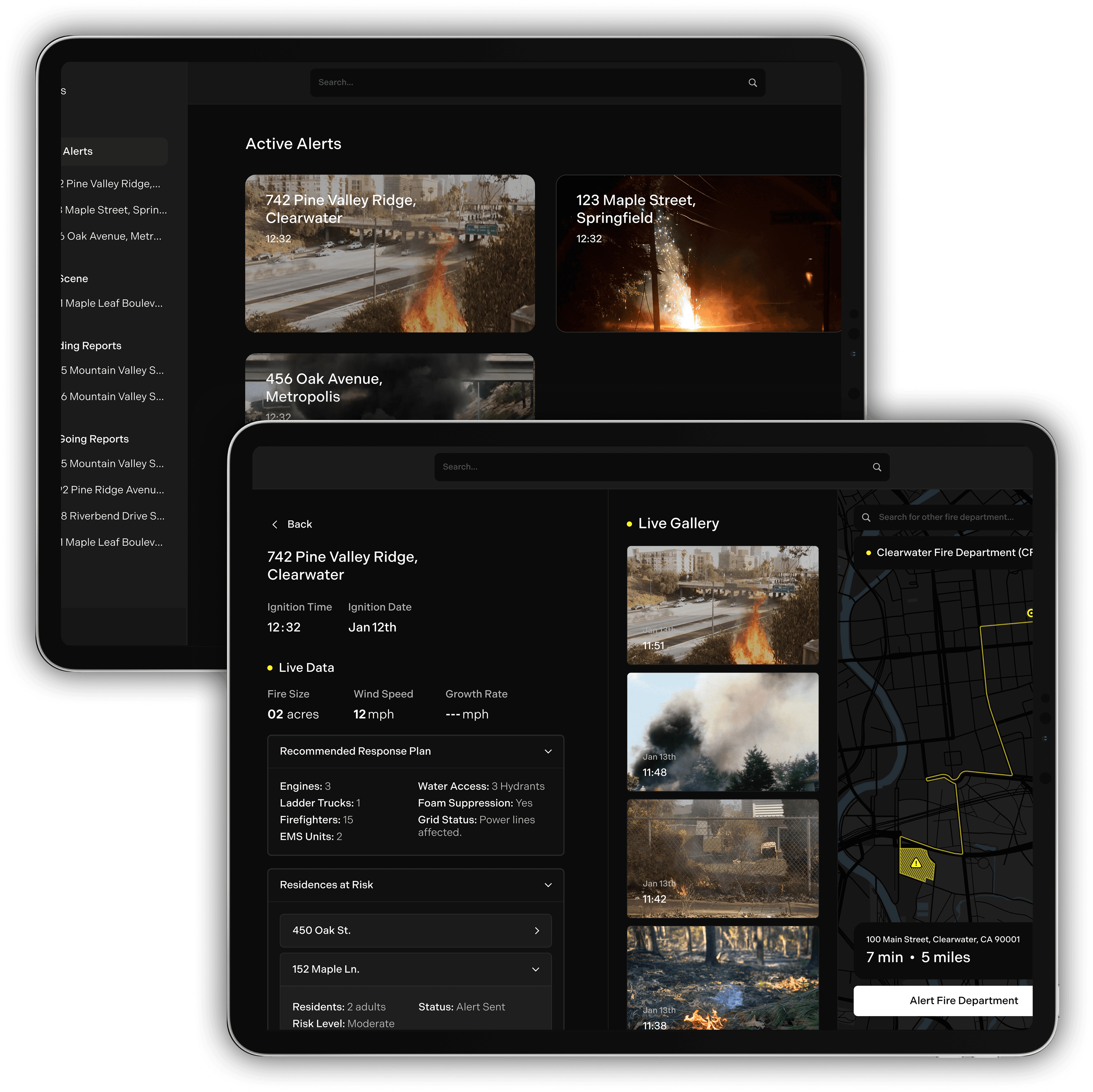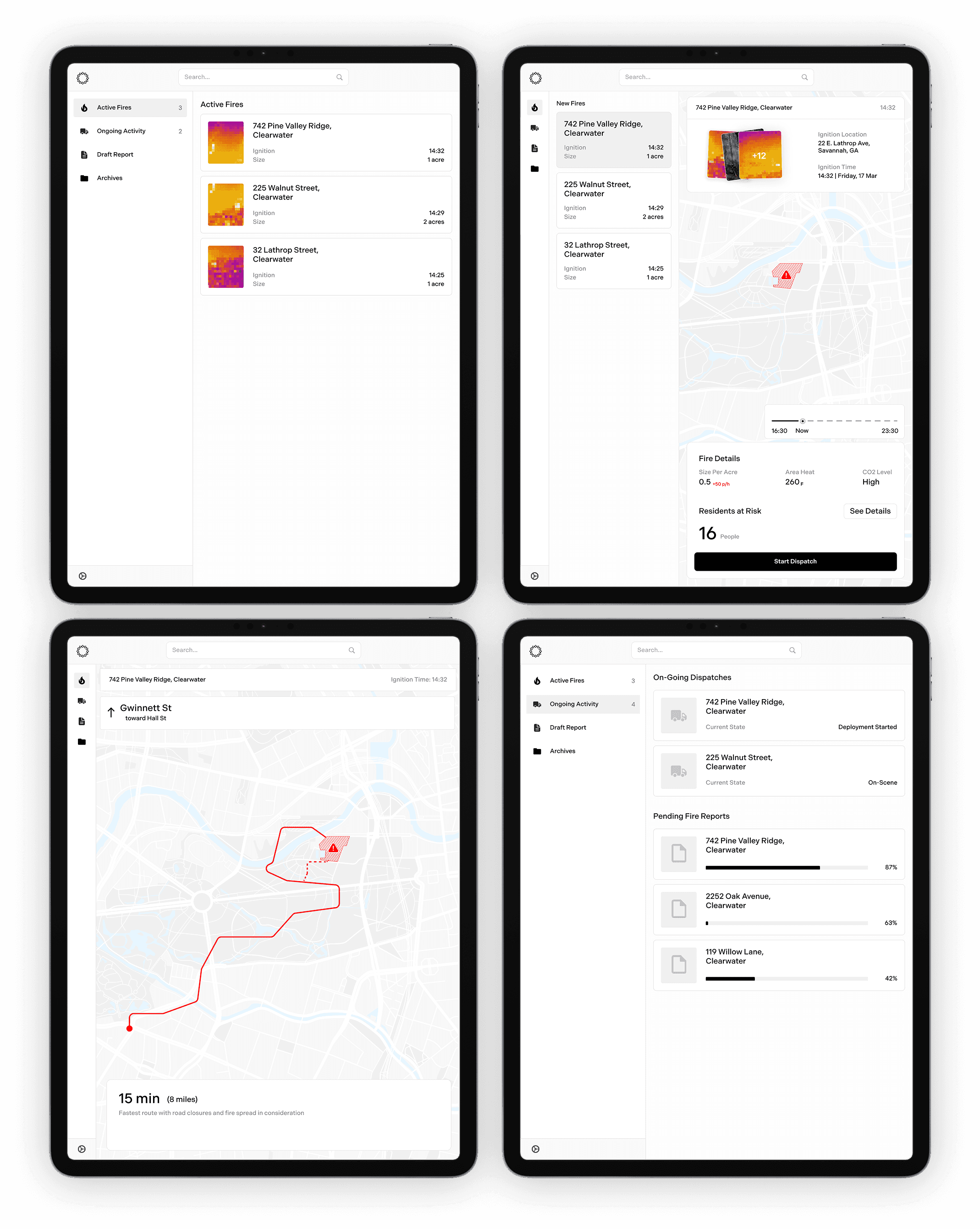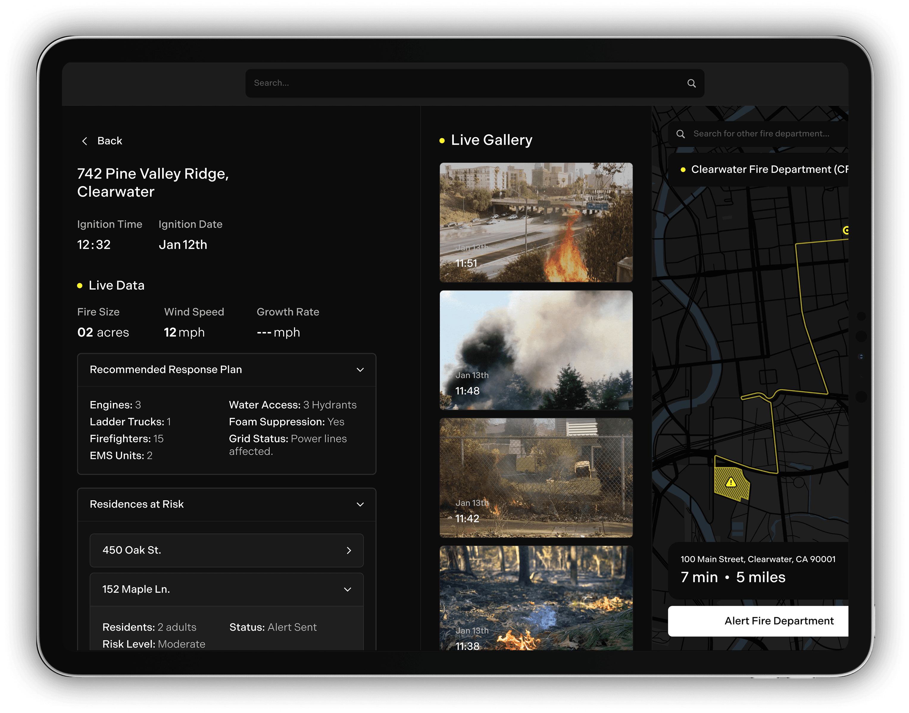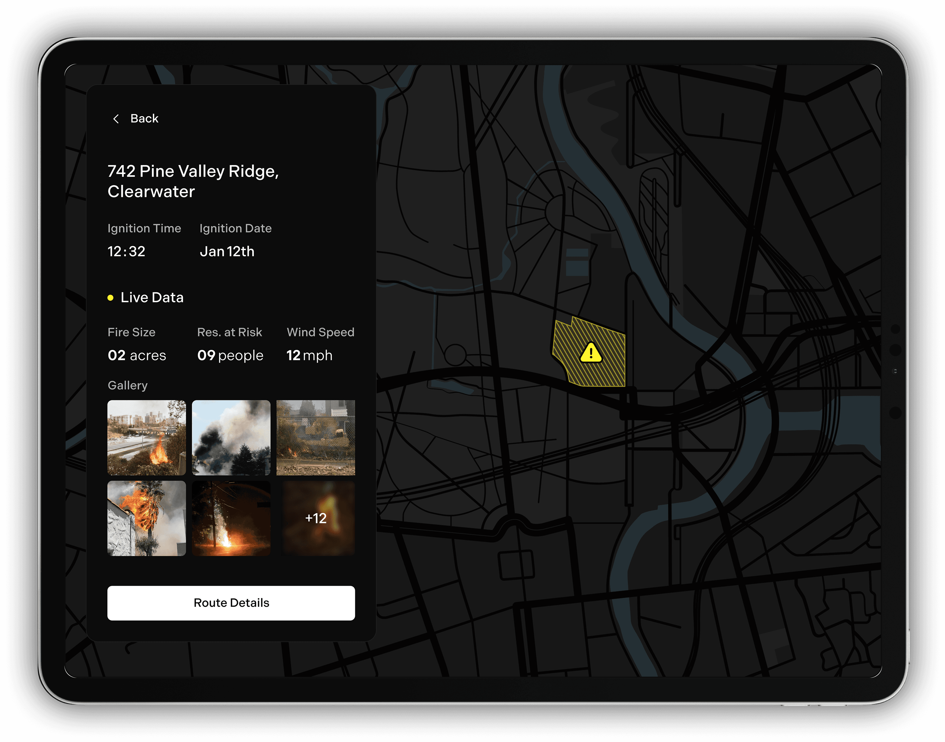 In the final dashboard, firefighters receive alerts from the dispatch center. Clicking into an alert first shows them live fire data, such as size, people at risk, wind speed, and images. Then, they get their optimized route to the fire.