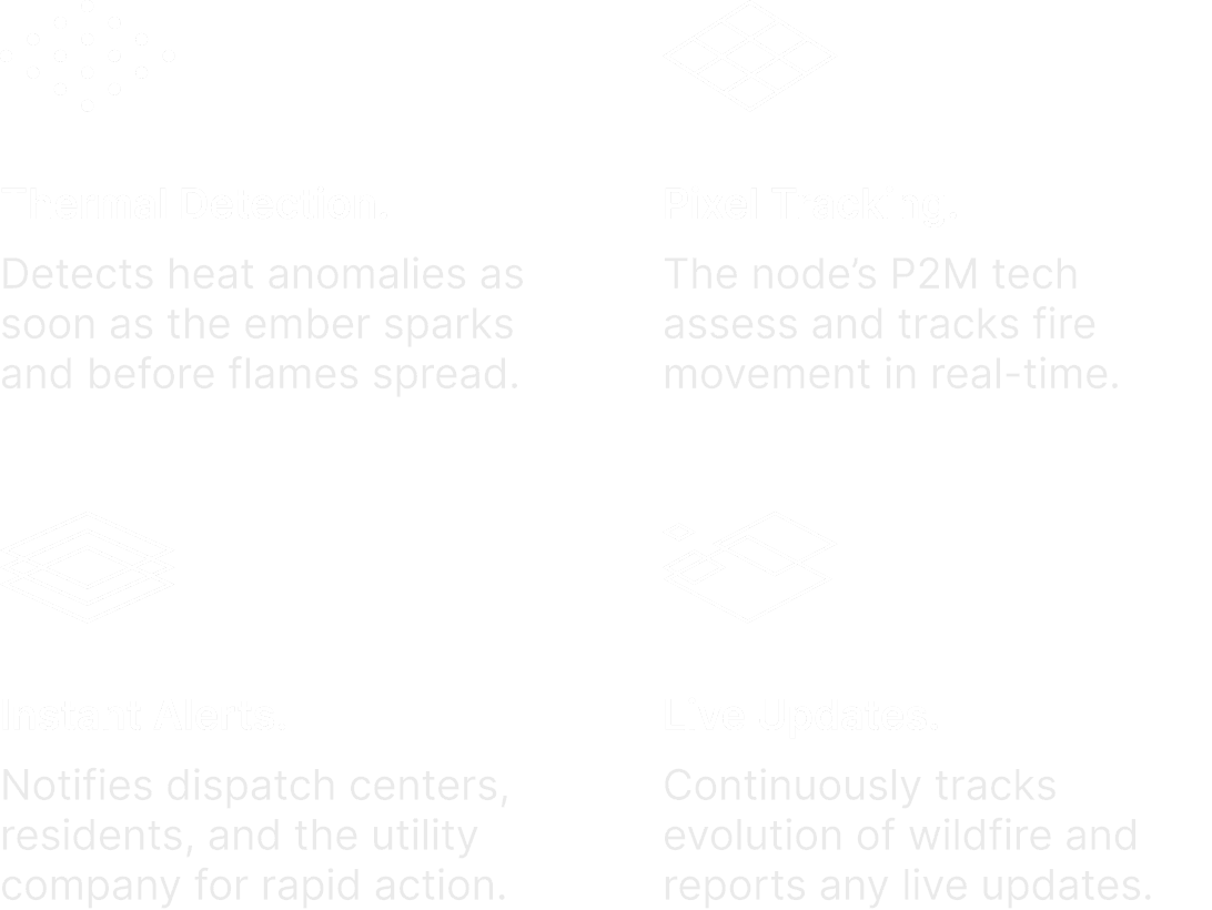 Torus nodes are installed every 1-2 miles along power lines, using P2M (Pixel-to-Memory) technology and thermal imaging to detect early wildfires on the ground or spark-related threats on the lines, then communicate across the network for a rapid, coordinated response.