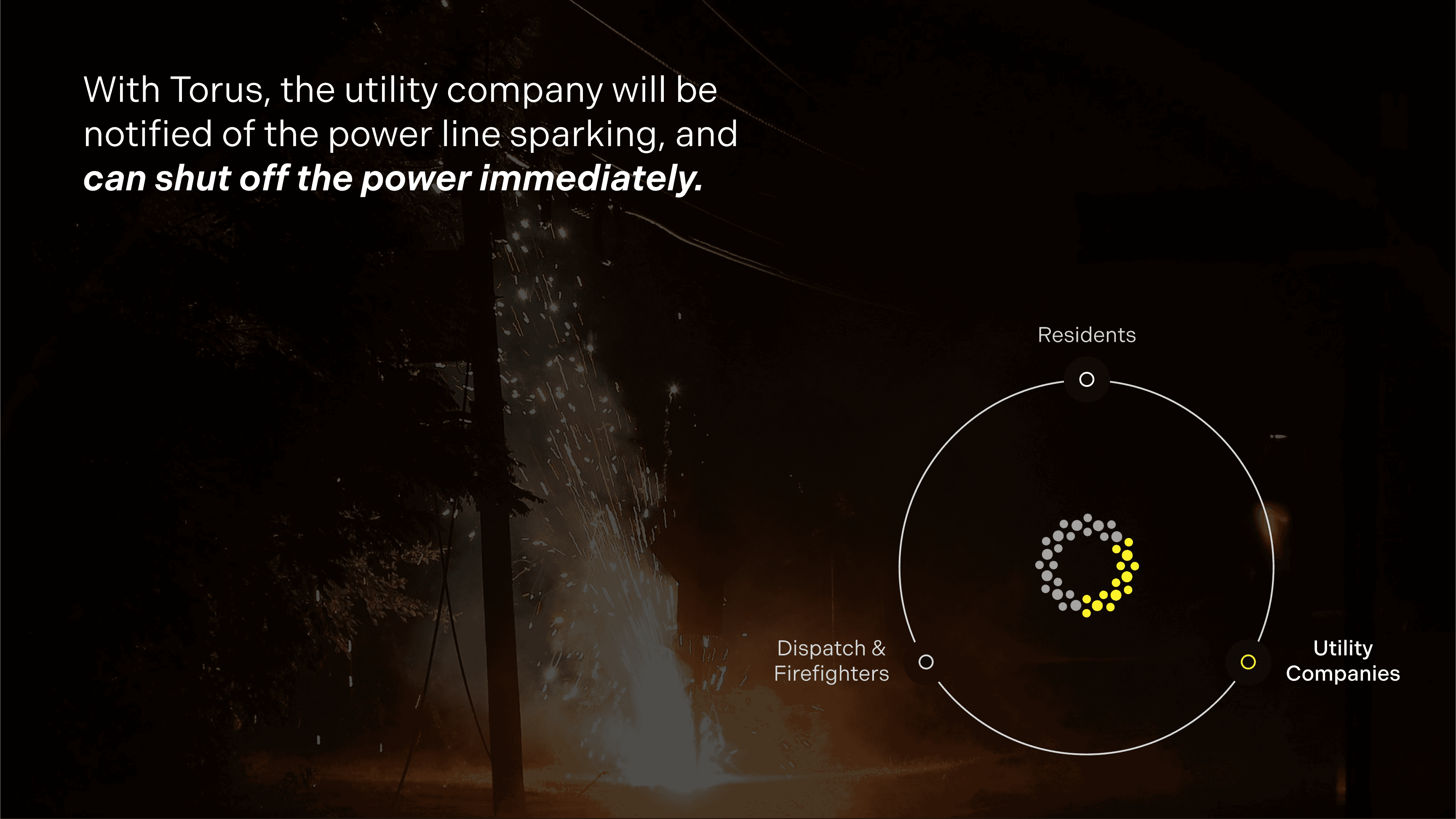 Torus is an AI-powered wildfire detection system installed directly on power lines that immediately notifies emergency responders, residents, and utility companies to fires or sparking lines to prevent disasters.