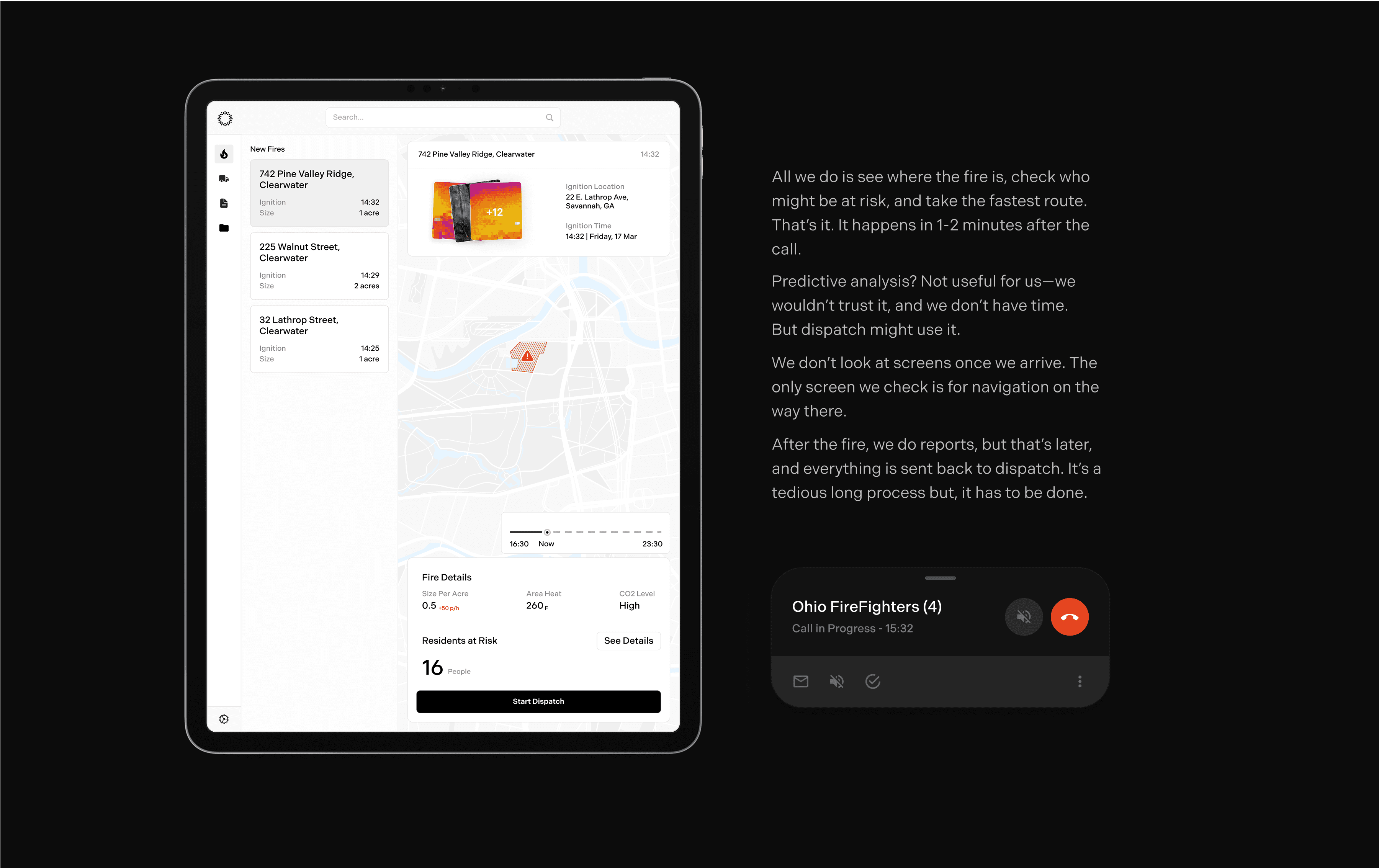 Four firefighters reviewed our mid-fidelity screen designs to help us validate the content and information flow. During the walkthrough, we uncovered unnecessary content, some meant for the wrong audience, and highlighted which elements were truly valuable. The biggest takeaway: simplify the dashboard even more. Firefighters primarily need key fire data and a clear, optimized route.